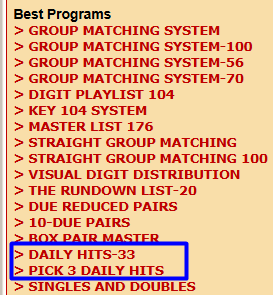 A good basic strategy for the Pick 3 game is identifying key digits that are most likely to hit in the next TWO drawings. This will narrow down your playlist. Use the programs below.