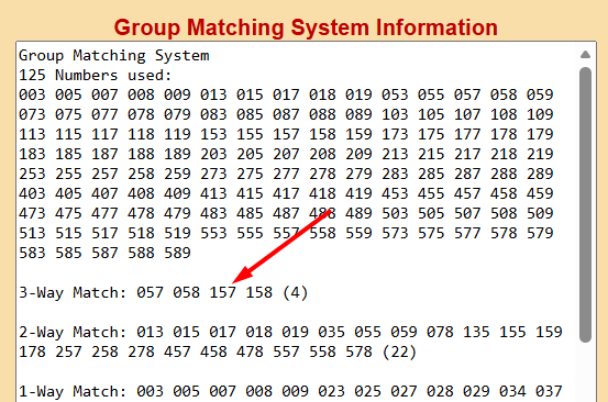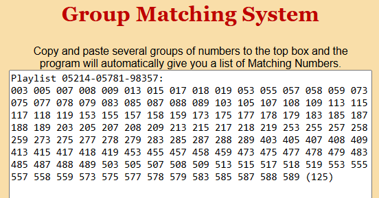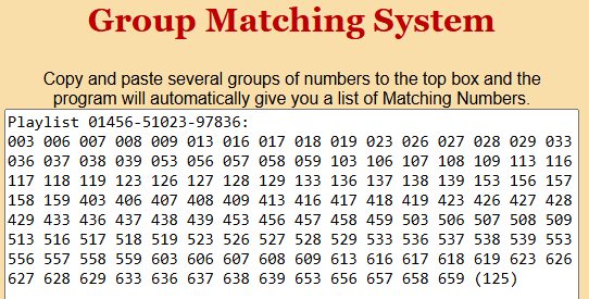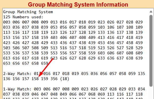 2-After you get the list, copy it into the Group matching program. This will tell you what numbers REPEAT (2-way, 3-way, 5-way, etc). These repeating numbers are the HOTTEST numbers in the box BECAUSE they can hit in more than one way.
