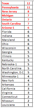 I just counted how many hits each state has gotten in the last 7 weeks (from the 10 number system) and the winners are Texas (12 hits), Pennsylvania (11 hits), and New Jersey (8 hits). Also Michigan, Ontario and South Carolina. You can see the hits from all 26 states on the chart below. I would consider the top 7 states to be the best for this 10 number system (based on the last 200 Pick 3 numbers entered into the Visual Digit Distribution-COLD 5 program). If you are in any of these 7 states, you should definitely pay to the 10 numbers I am posting on Sunday morning because there is an excellent chance that one of them will hit during the week (Sunday to Saturday). ARIZONA is significant because it has ONE drawing per day…yet it has averaged about one hit per week in the last 7 weeks. The same for NEBRAKA; it has done pretty well for a one draw per day state (5 hits in the last 7 weeks).