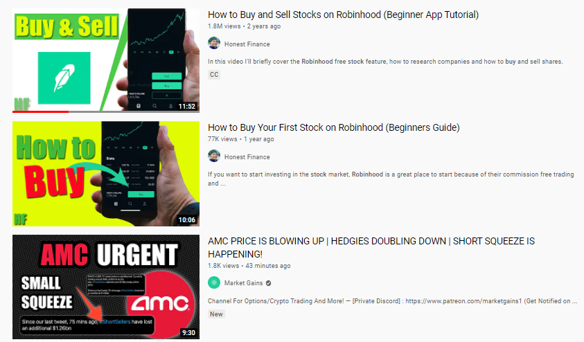 Whenever you have a question: Go to YouTube and write the question up on the search bar and the corresponding videos will show up. So here you would write on the search bar: how do I buy a stock on robinhood? …and several videos will show up: