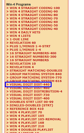 For those of you who have been asking me about the Win 4/Pick 4 game…..I have a training consisting of 20 lessons (20 emails). This training explains (step by step) exactly how to go about coding the Win 4 game using the Visual Digit Distribution 440 program (see below) and an excel sheet, which is included in the training. If you want this, its $60 for the 20 lessons. This includes 6 month access to my programs. If interested, email me with $60-WIN 4 TRAINING on the subject line of your email and I will send you a Paypal invoice for $60. I will email you the lessons after I get your payment. NOTE: You are better off spending this $60 on an AMC stock. Only pay for this if you already have several AMC stocks and you really like the Win 4 game.