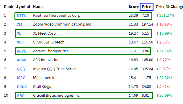 The trending stocks on this website change hour to hour. When I took a screenshot a few minutes ago, I got the stocks you see below. I am only interested in the stocks that are under $10. So I would start by buying 10 shares of KTTA which is at $7.10 right now. This means that I can buy 10 shares for $71. I would also buy 10 shares of XL (at $5.15 right now; 10 shares will cost $51.50). Also 10 shares of APVO ($9.86), and 10 shares of GRCL ($8.81).