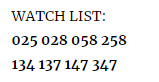 The 2-way list (numbers that show up on both lists) are: 025, 028, 058, 258.