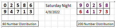 I came up with this list by wheeling the top 5 digits from both the 60 and 200 draw boxes. I got these boxes on SATURDAY night.