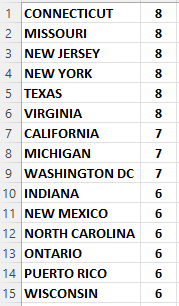 These 15 states did the best. The number on the right are the number of hits in the last 6 weeks.