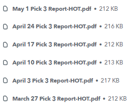 I had my assistant go back and redo the weekly reports starting from March 26 using the top 5 HOT digits in the last 60 drawings, using this program: