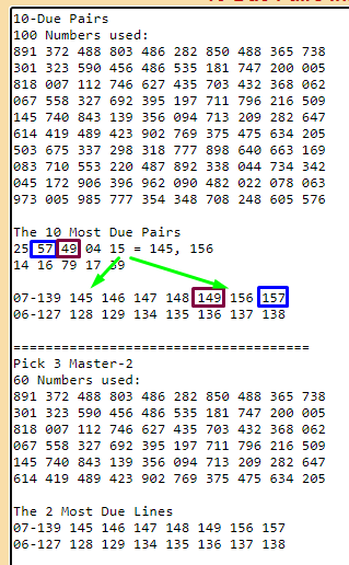 Here is a good example of how to use the 10 most due pairs to predict which of the two most due lines will most likely hit first. I will use OHIO numbers in my explanation. The two most due lines in Ohio right now are 7 and 6 (the most due line is always on the bottom; so line 6 is most due). However, based on what I am seeing below, a number from line 7 will most likely hit before a number from line 6 hits. I say that because due pair 57 points to 157. Pair 49 points to 149 and pair 15 points to numbers 145 and 156. Also, pairs 14 + 16 = 146 and pairs 14 + 17 = 147. All of these numbers are on line 7. So if I played Ohio numbers I would try to predict which of these 8 numbers will hit (most likely in 1 to 7 days): 139, 145, 146, 147, 148, 149, 156, or 157. The number 157 looks really good because three due pairs point to it: 57 + 15 + 17 = 157.