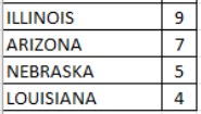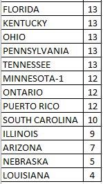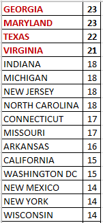 The worst performing states are below. These states got 13 or less hits in the last 19 weeks.