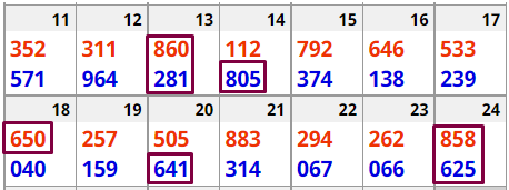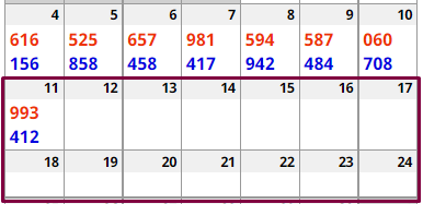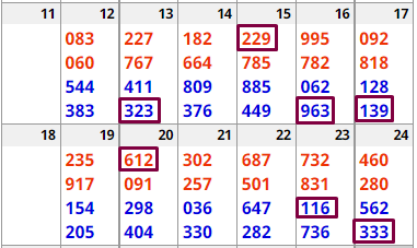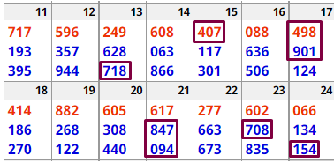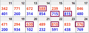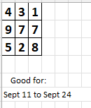 The numbers can be read in any direction. For example, based on this box, 137 or 138 can hit New York this week. 478 and 479 also look good. The same for 178, 571 and 978 (these are all BOX numbers by the way). The idea is that some combination of these digits will hit this or next week. I have seen up to 11 hits from this box in a two-week period! I suggest you test this out in your state. NOTE: Sometimes the top number (431) will hit STRAIGHT!