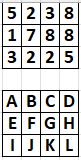 The locations of the digits are the key components of this coding system. And just like the 3×3 box, this system automatically removes digits (example: digits 0-4-6 are not in the box below). And like the 3×3 box, some numbers have more than one formula (this is a GOOD thing). For example, the number 5238 = ABCD, ABCG, ABIG, ABCH, GHKL, etc.