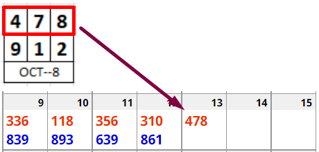 Notice that 478 was the top number in the box last week as well. 478 was the top number in the box on October 1 and October 8 (you always get the box on Saturday night). This means that we should pay attention to this rule: