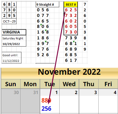 I made it clear on the sheet and the report for VA: the BEST numbers are the five red numbers. As you can see on the Excel sheet for Virginia for this week; the best number is 625 (it is on top of the list). By the way; these are all BOX numbers. 625 just hit VA as 256. Notice: it is also a straight number (526). IMPORTANT: If you only play the BEST red numbers on my sheets, you will get at least one hit most weeks! You are not going to hit every single week – but you will get a hit most weeks. The sheet is HERE.