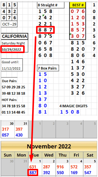 Here is a recent straight hit from a sheet. Below is the sheet for CA for OCT 29. 887 is one of the 8 straight numbers for the week. It hit 3 days later on November 1. Sheets are available for purchase HERE.