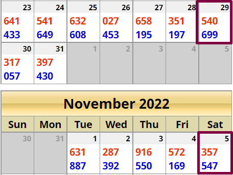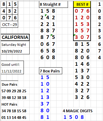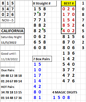The sheet for CALIFORNIA is HERE—Below are this weeks and last weeks sheet for CA. The last set of 200 numbers is on the bottom (feel free to double check my set of 200 numbers for this and last week; if you see an error, let me know). The number 887 (Nov 1) is a STRAIGHT hit from last weeks sheet! No hits yet from the 4 magic digits (1508)…so one of these numbers can hit this week: 015 018 058 158. PLAY 158 STRAIGHT in CA this week! Why? Because of due pair 18 and hot pairs 18 and 15; and the top straight number is 158.