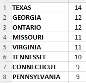 I posted the EXCEL sheet for this week HERE. It shows the hits in the last 9 weeks. I sorted the states by the number of hits they got in the last 9 weeks. The states that came up on top are below. These states have gotten the most hits. If you play my numbers in these 8 states every week, you will get SEVERAL hits EVERY SINGLE WEEK–GUARANTEED.