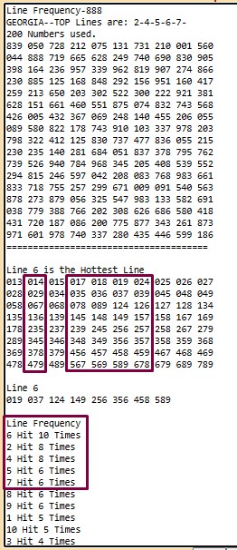 These are the top lines in Georgia. This means that if a SINGLE hits, it will most likely be on this list of 40 numbers. The 458 that today is in line 6 (the hottest line).