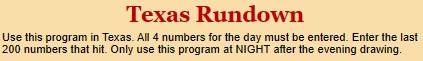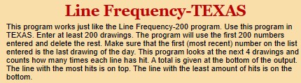 ATTENTION TEXAS Players: This program is specifically for the TEXAS Pick 3 game. It gives you the hottest line. NOTE: This program will many times give you the SAME list of 8 numbers that the main program gives you (Line Frequency 200).