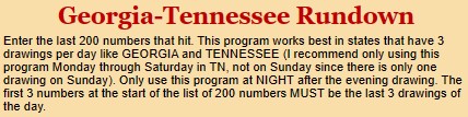 The GEORGIA-TENNESSEE program gives you the Most Due Line or Coldest line of 8 numbers in GE and TN (I started using this program…then I switched to the HOTTEST line in the Rundown List). By the way, you can play both sets of numbers. You can play 16 numbers per state: the 8 hottest and 8 coldest numbers.