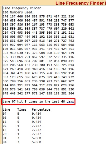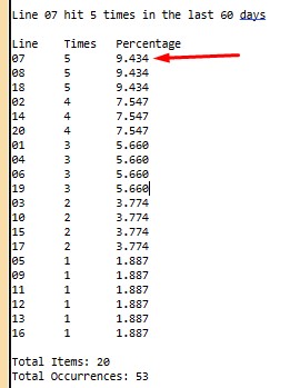 The Line Frequency Finder program list all 20 lines, with the line that hit the most up on top (7) and the line that hit the most on the bottom (16).