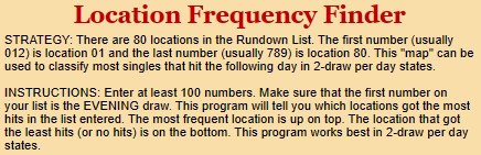 Here is something really interesting: there are 80 “locations” in the Rundown List. For example, 015 below is in location 01, 016 is in location 02, 034 is in location 10, 058 is in location 20, 458 is in location 70 and 678 is in location 80. What if there was a program that told you which location hit the most in your state in the last 100 or 200 drawings? Would that be useful?