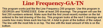 ATTENTION GEORGIA and TENNESSEE Players: This program is specifically for GA and TN. This program should give you more accurate numbers than the main program (Line Frequency 200) because this program specifically looks at the next 3 drawings to determine which line of 8 numbers is the hottest. NOTE: This program will many times give you the SAME list of 8 numbers that the main program gives you (Line Frequency 200).