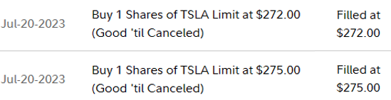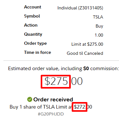 Bottom Line: I purchased two shares of Tesla; one for $275 and a second one for $272 because I am expecting the price to go back up to $300 per shares soon (by the way, I buy my shares through Fidelity).