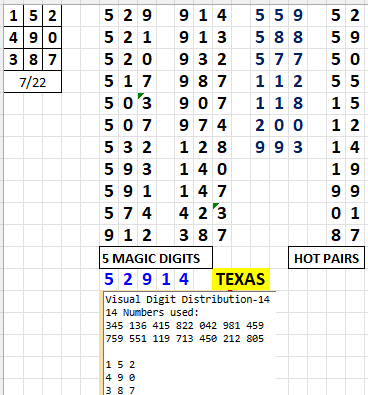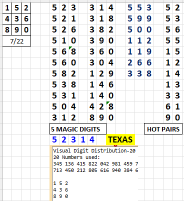 I am currently coaching someone on the Texas Pick 3 game using the Excel sheet system on THIS product. I am posing these two sheets for tomorrow. Below are the 14 and 20 draw distribution sheets for Texas. I found that if you see the 2nd digit repeating on the 14, 20, and 28 draw distributions, there is a good chance that digit will hit the following day. For example; based on the sheets below, a 5 should hit TEXAS tomorrow (Monday July 24). That is the case in NY….it may or may not be the case in Texas. Let’s see what hits tomorrow in TX. If you are interested in coaching (for ANY state) go here for details.