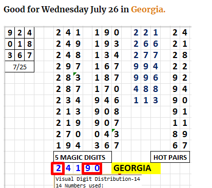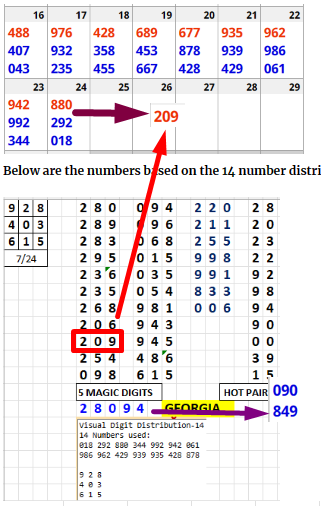 Every state is different. You have to look at the numbers that hit to figure out how the sheet works in your state. For example, it looks like the sheet is good for the next TWO days in Georgia. In other words, the sheet from MONDAY will tell you what numbers will hit on WEDNESDAY. For example…209 hit on Wednesday but its not on the sheet from Tuesday..its on the sheet from MONDAY. Also…the 5 magic digits work very well in GA. The 849 that hit came from the 5 digits from the MONDAY sheet.