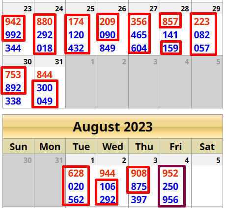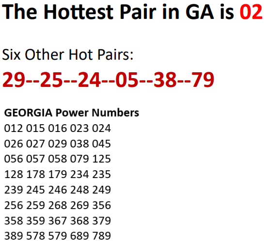 I posted the Georgia report HERE. What you want to do in GA is (whenever possible) play numbers with digits 2, 0, or 5. These are the three hottest digits in GA: 2-0-5. The number 250 hit yesterday. 952 hit in the morning (has a 2 and a 5) and 956 hit in the evening (has a 5).