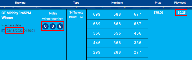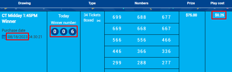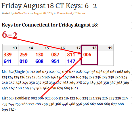 This system is working way better than I expected. These two digits were predicted last night (see previous post). This is not a fluke. The digits that I am predicting for Connecticut are hitting EVERY SINGLE DAY. To learn more about this AMAZING system, go HERE. Go to the bottom of the page HERE to see all the previous hits from this DAILY prediction system. NOTE: I will be going BIG on this system – but not just yet. I want to see a few more hits from this system before putting a lot of money on these numbers.