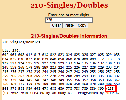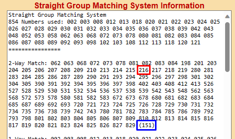 STEP 4-Enter the 200 Straight numbers and the 654 Straight numbers (Total: 854) into the Straight Group Matching Program to find the 2-way list (numbers on both lists). The list will be large (151 straight numbers in this example)- but if played online for 0.25 cents, it will just cost $37.75. The payout is $225.