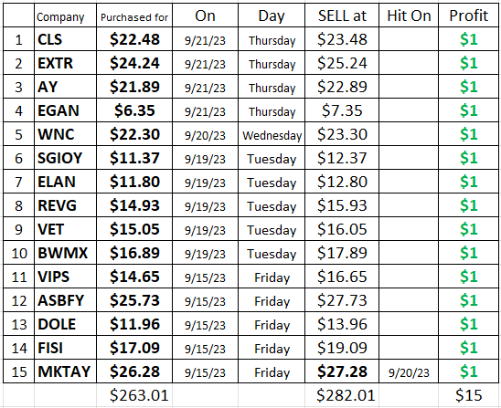 I will post my updated stock chart on the bottom of THIS PAGE (if you want to see the last stocks I added). I set the target to be a $1 rise in price for all the stocks. The first stock to hit the target was MKTAY; it went from $26.28 to $27.28 yesterday (#15 on the chart below). One or two more stocks should hit the target today. I will be posting where I get these stocks in a day or two. In the meantime, buy ONE stock to learn more about stock investing – also watch some of these videos. If this is not for you, I am still posting the 5 number report HERE.