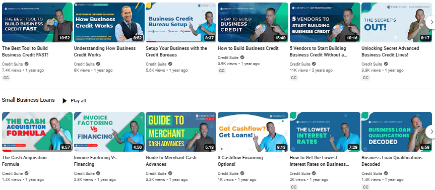 Another excellent source of information on how to build personal and business credit is Credit Suite. They have many videos on YouTube. I recommend you watch 20 of them. You will be amazed at what you will learn. You can find the channel here.