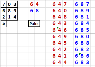 The top 5 numbers are the best. This means that if pair 68 hits tonight or tomorrow, it will most likely hit as 687, 689, 681, 684, or 685. It is less likely to hit as 686 or 683. If pair 64 hits, it is more likely to hit as 647, 640, 648, 643, or 646. It is less likely to hit as 641 or 644.