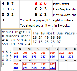 “What is my goal here; to show that I can predict numbers – or to MAKE MONEY??” I asked myself that question today…and my answer was to MAKE MONEY. So I changed the sheet (again). I removed the digits (and pairs) and now I just give you ONE super number to play (which you should play 6 ways) plus two back up numbers. With this updated system you WILL make money – but you will have to WAIT and play the numbers consistently. A week or two may pass with no hits – but if you stick it out for 3 or 4 weeks, you will be rewarded. I updated the sheet again; now I just give you ONE super number; it’s up on top. 326 is the top number. You can play it box – but I recommend you play it 6-ways for a straight hit (236, 263, 326, 362, 623, 632). This will pay you $900 if you play it online for $1 straight ($12 per day). Play the next two numbers (023 and 921) Box and Straight. That means that you will be playing 8 straight numbers. If that’s too much, just play the 6 straight numbers (based on the top number: 326). REDUCED: If you cannot afford to play 8 numbers per day, do this: Just play the 3 numbers boxed and straight – but if the top number decides to hit another way (say; 263), you will miss the straight hit. IMPORTANT: these 3 numbers change every night based on the distribution of the last 8 numbers (updated sheet found HERE).