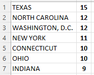 UPDATE: Look at the SORTED page on the Excel sheet. As you can see, the two coldest states are Louisiana and Nebraska. LA only got 2 hits in the last 9 weeks and Nebraska just got ONE hit in the last 9 weeks. Therefore, I am removing these two states from the report.