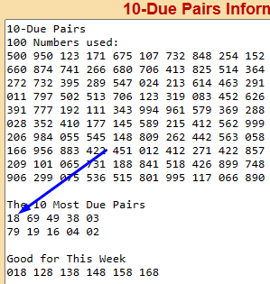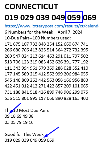 This 6 number system works extremely well in Connecticut. Once again (like last week), the most due pair (09) hit THE NEXT DAY (the 6 numbers are HERE).