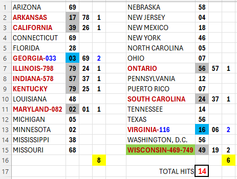 If the 10 numbers for each pair are played and if we count each double that hits as TWO hits…this would have generated 14 hits so far (Sunday, Monday, Tuesday). Notice below that pair 03 hit as a DOUBLE in Georgia: 033. All 10 numbers had to be played to hit 798 in Illinois and the 578 in Indiana. In Maryland, all 10 numbers had to be played to hit the 082 that hit on Monday. Notice that Virginia got a double (116) …but this required that all 10 numbers be played. The states on the LEFT (Arizona to Missouri) got 8 hits so far – and the numbers on the RIGHT (Nebraska to Wisconsin) got 6 hits (I am counting the doubles as 2 hits: the 033 in Georgia and the 116 in Virginia). YOU CAN DOWNLOAD THIS EXCEL SHEET HERE.