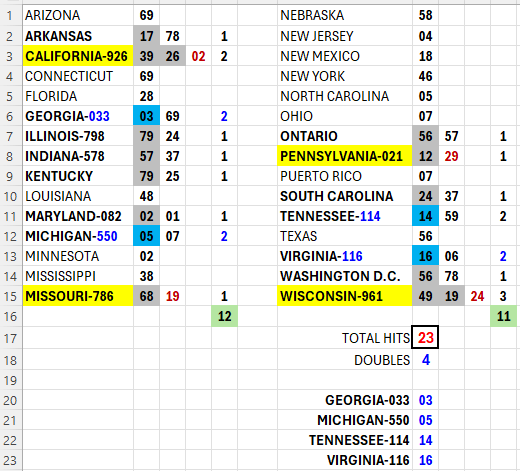 Below is the updated Excel sheet which you can download HERE. So far there have been 23 hits and 4 of those hits were doubles.