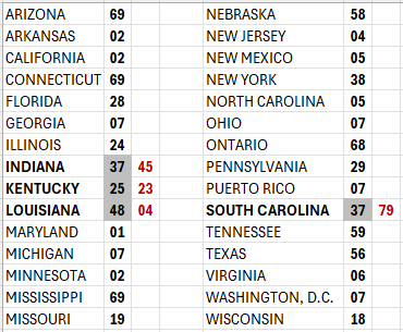 As I predicted, South Carolina got a hit. Pair 37 hit SC in 307. The new pair for SC is 79. There is a good chance that pair 37 will hit again this week in SC. Indiana, Kentucky, and Louisiana also got a hit. The new chart is below. Also posted HERE.