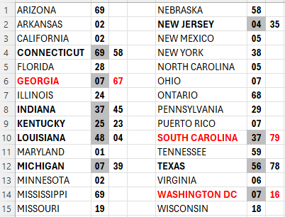 I recommend playing all 10 numbers for the most due pair in Georgia, South Carolina, and Washington DC. You should see about 3 hits per week!