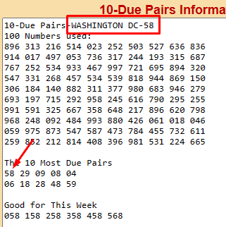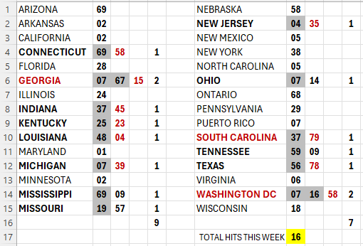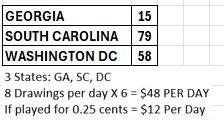 REMINDER: For now, only play 3 states (the 3 red states below): GEORGIA, SOUTH CAROLINA, and WASH DC. Washington DC got a hit yesterday (pair 16 hit in 216). Also TENN got a hit (pair 59 hit in 495). UPDATE: It looks like you will show a profit JUST playing the 6 numbers for these 3 states.