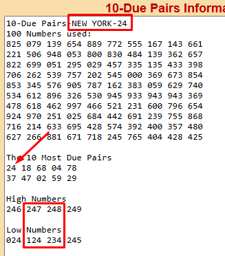 I just made a BIG discovery regarding the exact numbers that tend to hit for each most due pair, which I explain HERE. For example, the new most due pair for NY right now is 24. Assuming a single hits, it will most likely hit in numbers 247, 248, 124, or 234. This system does not work every time, but it will help you reduce the 10 numbers down to 2 or 4 numbers most of the time. And even when you don’t hit, its fine because you only played 2 or 4 numbers – not 10 or 8 numbers.