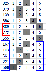 Track the numbers in your state like you see below (read from BOTTOM to the TOP…506 hit a while back….825 is the most recent number that hit). The blue boxes show that a number from group 5 has NOT hit…which means that a number from group 5 should hit soon….which means that DOUBLES will hit soon. For example, doubles 772 and 889 are in group 5. They hit AFTER group 5 was cold in 5 drawings.