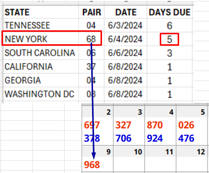 Sheet posted HERE and HERE. Pair 68 hit in NEW YORK. This is the 3rd hit in 2 days. I will update the sheet later today. This is NOT the number I thought would hit for pair 68. So playing all 10 numbers seems to be the best strategy – However, one of the first 6 numbers hit in the two previous hits. Notice that it’s the 2nd number from the top (the states with the highest due dates are the best).