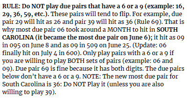 RULE 69 states that a 6 tends to hit as a 9 and a 9 tends to hit as a 6. So if your workout tells you that 346 is hot right now you should also play 349 and if 459 should hit soon you should also play 456. The same is true with due pairs; if the most due pair is 06, you will most likely see it hitting as 09 before it hits as 06.