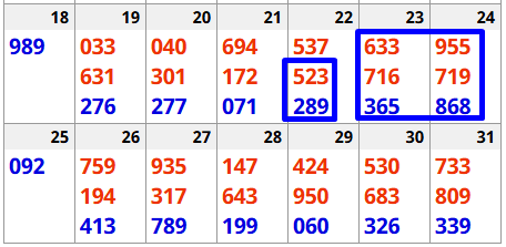 These are the 8 numbers from the 24th: 868 719 955 365 716 633 289 523