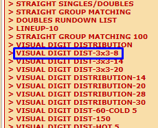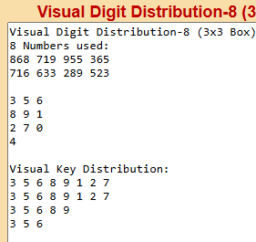 I get this question alot..”how can I use this program to predict numbers?” The best way is to get the output on Saturday night and then see what hits the following week. See where the numbers that hit are in the output. You will come up with conclusions – but you must test those conclusions by doing this again and again (get the output for several Saturdays and see what hits the following week). For example….lets say someone asks me how this program works…the Visual Digit Dist-3×3-8 program. This program gives you the distribution of the last 8 Pick 3 numbers that hit. I will test it out in Tennessee on SATURDAY AUGUST 24.
