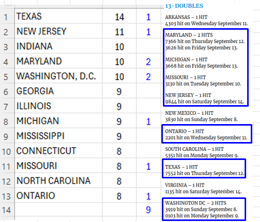 Most of the hits are coming from the 13 states listed below. As a matter of fact, 9 out of the 13 doubles that hit last week came from the top 13 states.