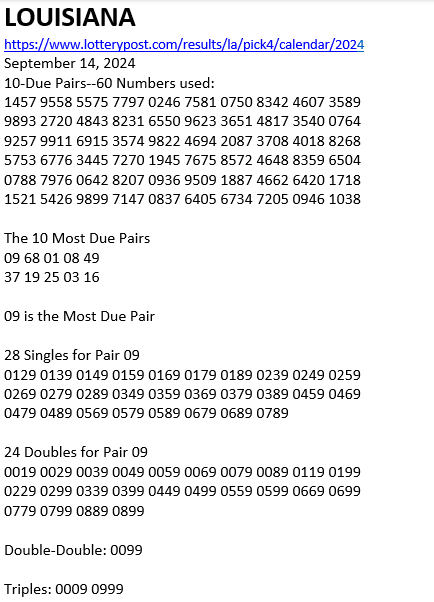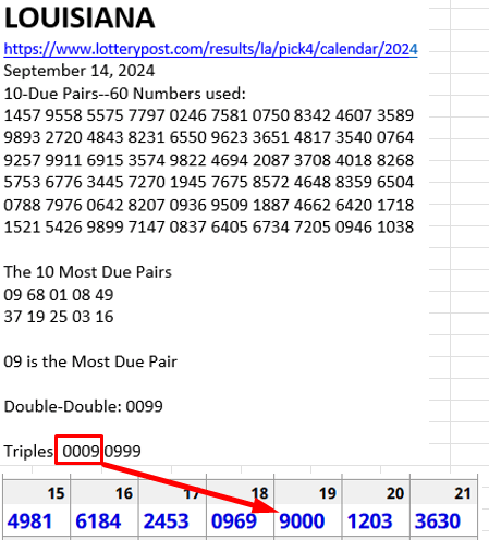 CLARIFICATION: Below is the Pick 4 Report for Louisiana I posted last SUNDAY (September 15) HERE. I post a similar report for 25 other states. Notice that the prediction is based on the most due pair (09) and includes 28 Singles, 24 Doubles, one Double-Double and two Triples. STRATEGY: if you only play the DD and Triples (3 numbers per state) you will get a hit MOST WEEKS.